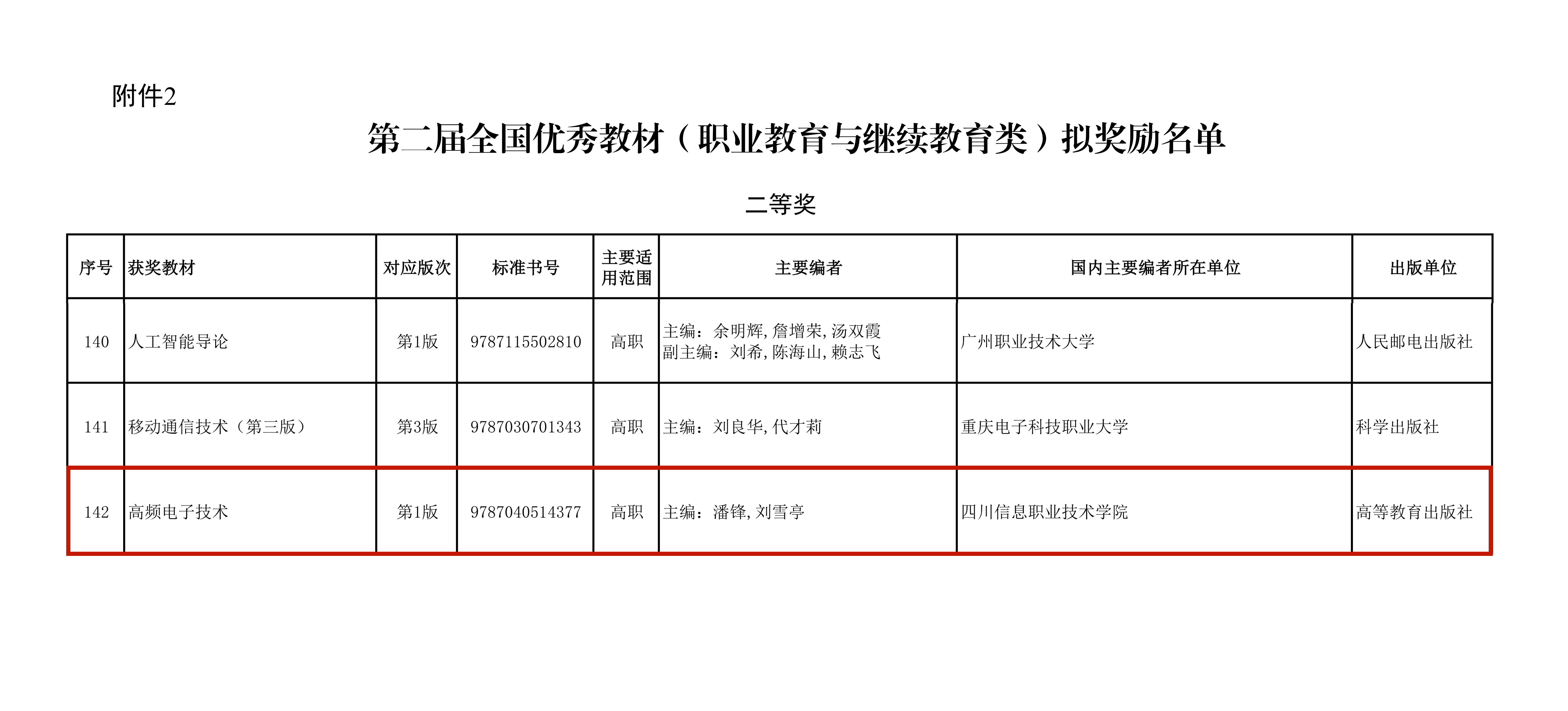 第二届全国优秀教材(职业教育与继续教育类)拟奖励名单